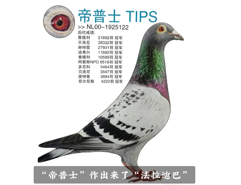 在“小迪克”众多优秀的子代中,有一羽被公认为最为耀眼的明星,它的名字叫“阿拉丁”,为我们打开了赛鸽神话之门。它作育出了名鸽“帝普士”,而“帝普士”又进一步育出了WHZB全国长距离鸽王冠军、TBOTB全国长距离鸽王冠军“法拉迪巴”,这一系列成就彻底改变了荷兰名家玛丽·温克的赛鸽人生。