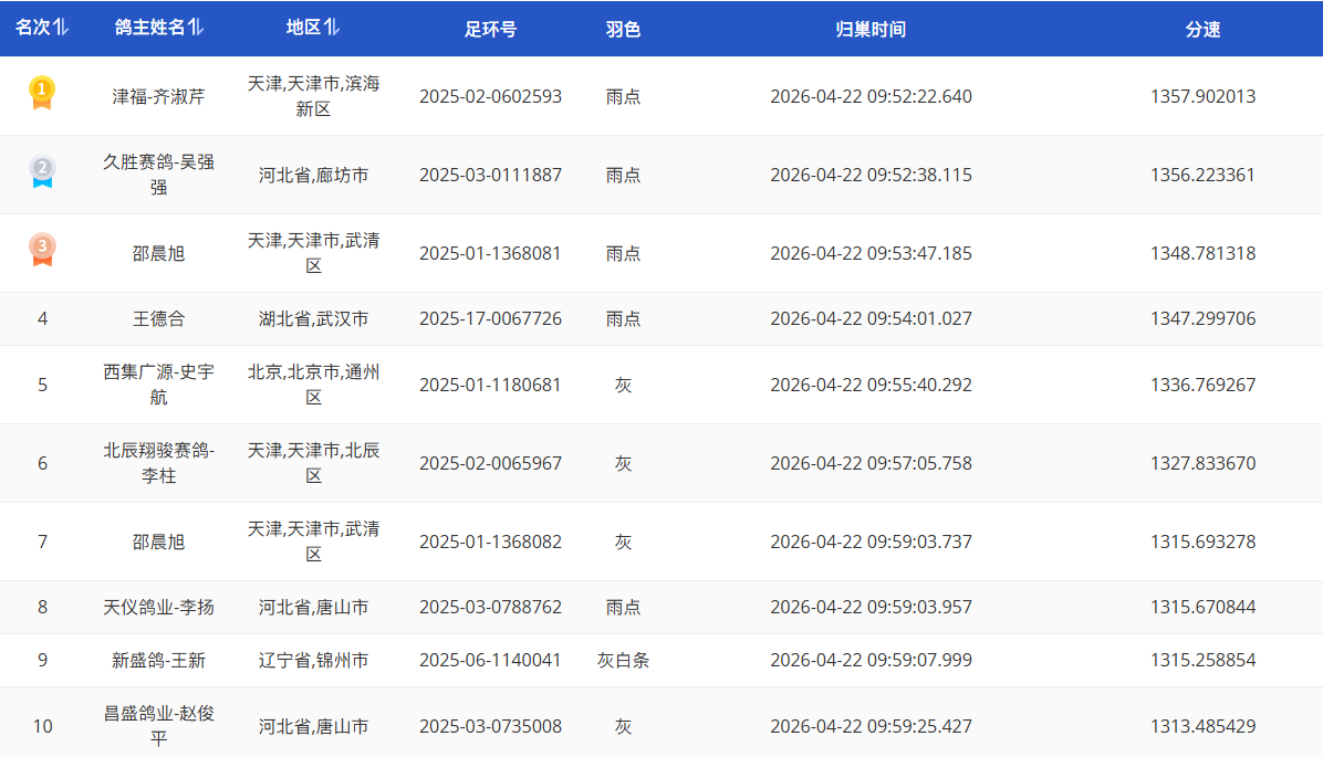 上午9时52分,鸽友津福齐淑芹的一羽2025-02-0602593雨点率先报进,分速1357.9020米/分,斩获冠军。久胜赛鸽吴强强的一羽2025-03-0111887雨点,分速1356.2233米/分,获得亚军。鸽友邵晨旭的一羽2025-01-1368081雨点,分速1348.7813米/分,获得季军。