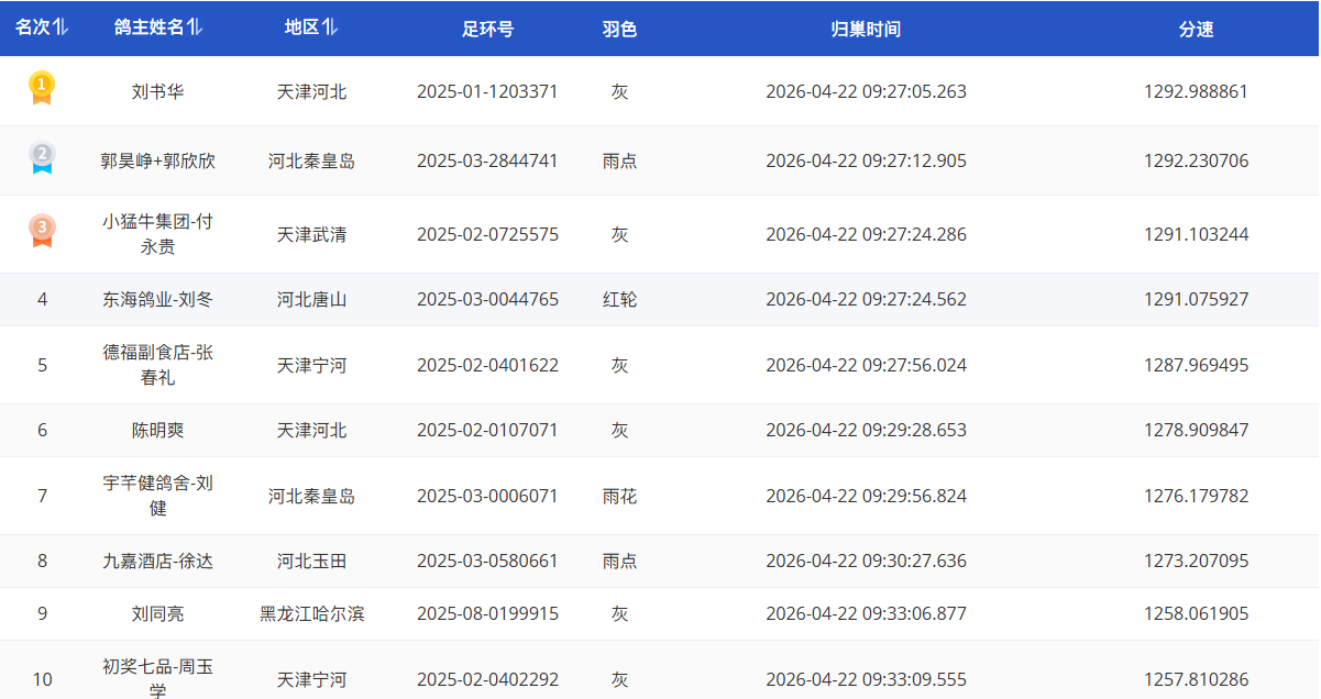 上午9时27分,鸽友刘书华的一羽2025-01-1203371灰率先打钟报进,分速1292.9888米/分,斩获一关冠军。紧接着鸽友郭昊峥+郭欣欣的一羽2025-03-2844741雨点报进,分速1292.2307米/分,获得亚军。鸽友小猛牛集团付永贵的2025-02-0725575灰,分速1291.1032米/分,拿下季军。