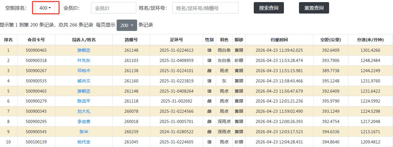 11时53分28秒,鸽友叶先东的一羽2025-31-0408959砂眼灰白条雄报进,飞行空距393公里,分速1248.2484米/分,暂列第二。