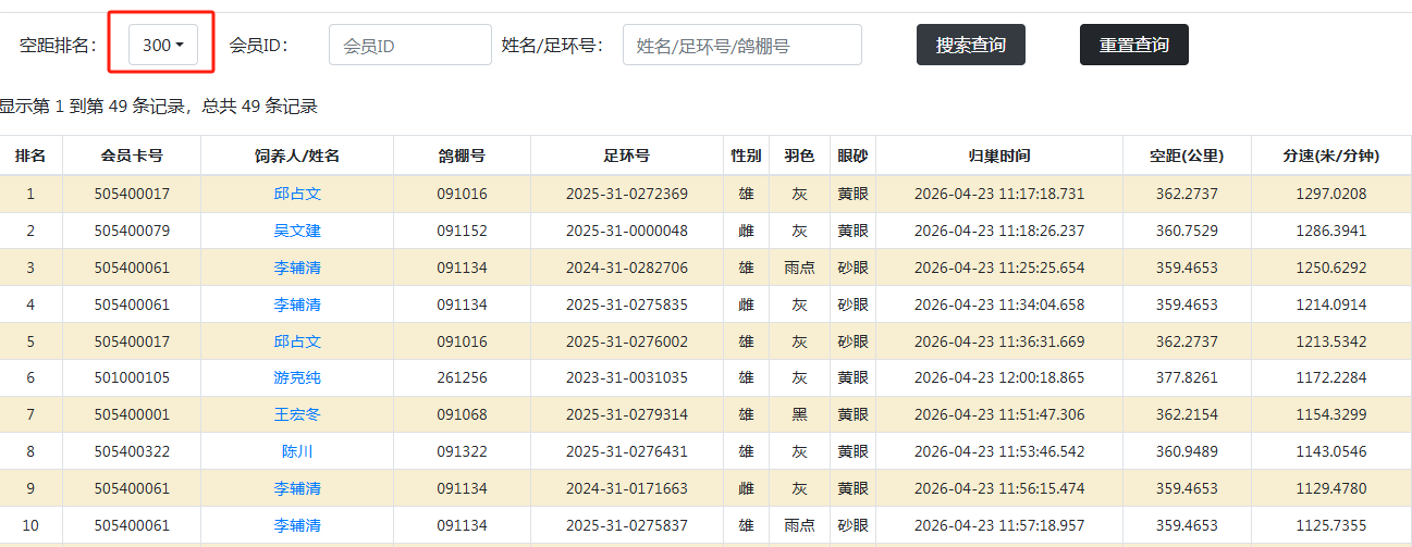 11时17分18秒,鸽友邱占文的一羽2025-31-0272369黄眼灰色雄鸽报进,飞行空距362.2公里,分速1297.0208米/分,暂列第一。