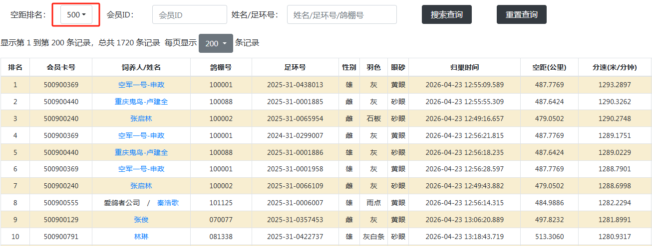 12时55分09秒,空军一号-申政的一羽2025-31-0438013黄眼灰色雄鸽报进,飞行空距487.7公里,分速1293.2897米/分,暂列第一