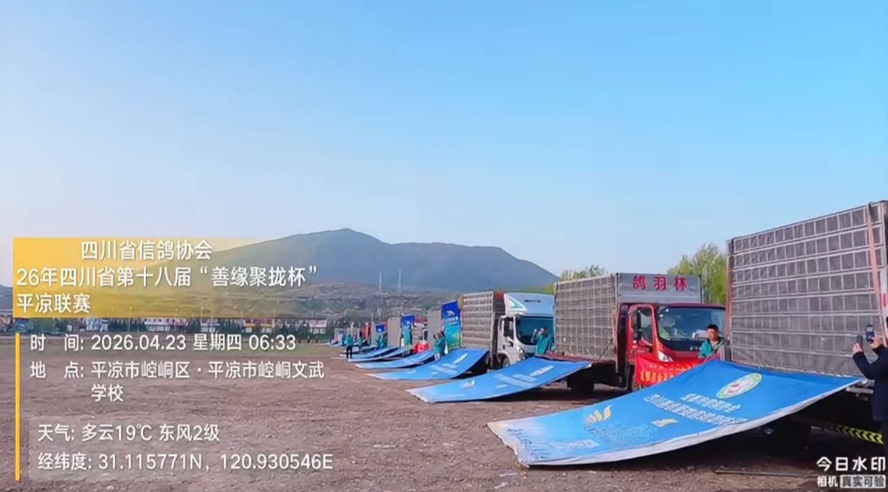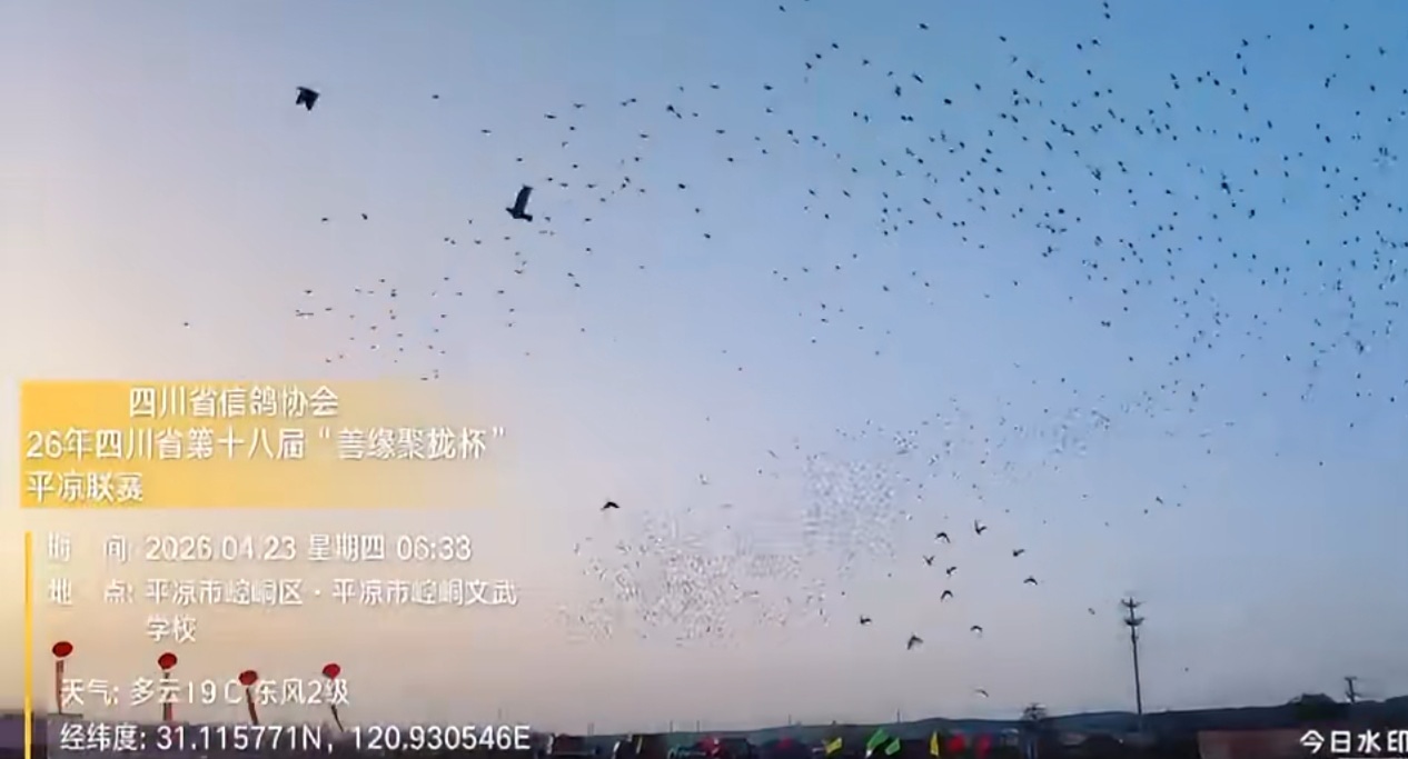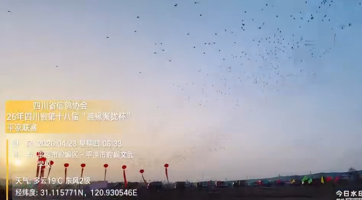 2026年4月23日上午6点33分,由四川省信鸽协会主办的第二十六届信鸽国家赛暨四川省第十八届信鸽比赛在甘肃平凉司放地准时开笼。司放地平凉今日晴间多云,平均气温从5℃至22℃之间,伴有3级西南风。