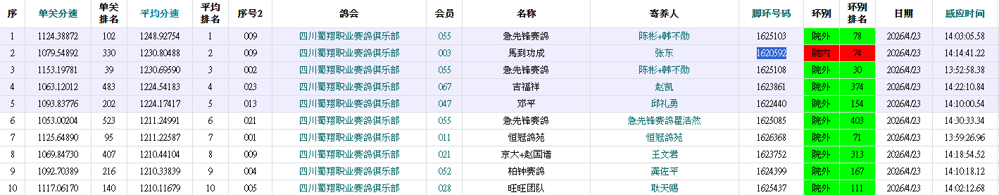 13:31:32,聚缘团队-勇翔+邱礼勇的1621685赛鸽率先归巢,以1205.7643米/分的分速拔得头筹;13:32:54,杜涛-王贺的1623298赛鸽紧随其后报进,飞出1205.4124米/分的分速,成功斩获亚军;13:31:44,雄起团队-华泰鸽舍苏良东的1623395赛鸽,以1205.3808米/分的分速拿下季军。