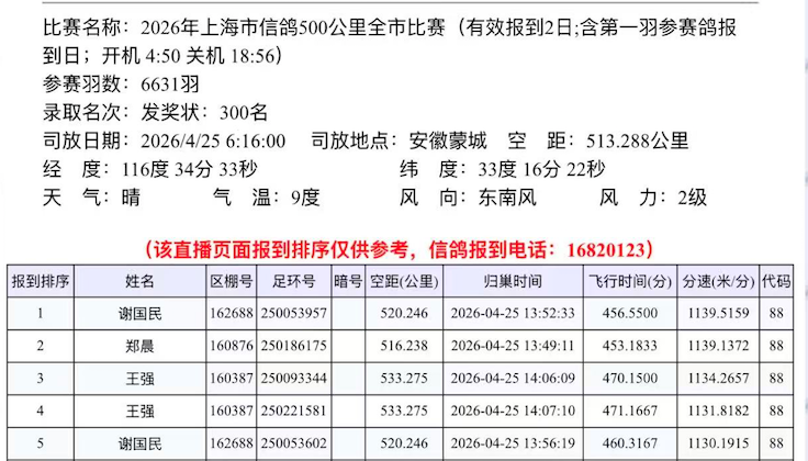 2026年4月25日6点16分,上海市500公里赛开笼司放。