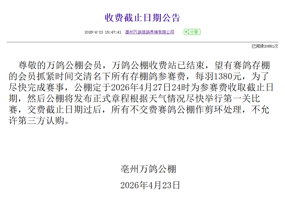 4月23日,安徽亳州万鸽公棚发布了一则收费截止日期公告,公告如下: