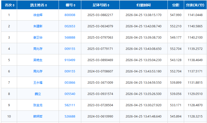 13点38分,一羽独归,是来自徐金辉的2025-03-0882217赛鸽,此鸽以1141.0448米/分的分速率先进棚,一举夺下本关冠军。4分钟后,朱建新的2025-03-0634079赛鸽随后斩获亚军,平均分速1140.5865米/分;季军则由谢卫华的2025-03-0797063赛鸽获得,平均分速为1140.2100米/分。截至4月26日下午18点前,共计6107羽赛鸽顺利归巢报到,归巢率为75.97%。
