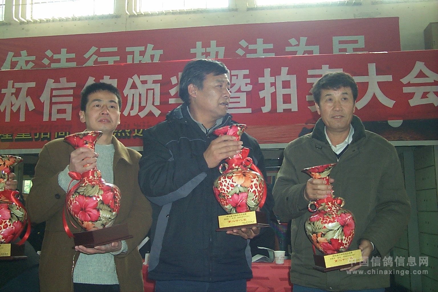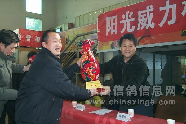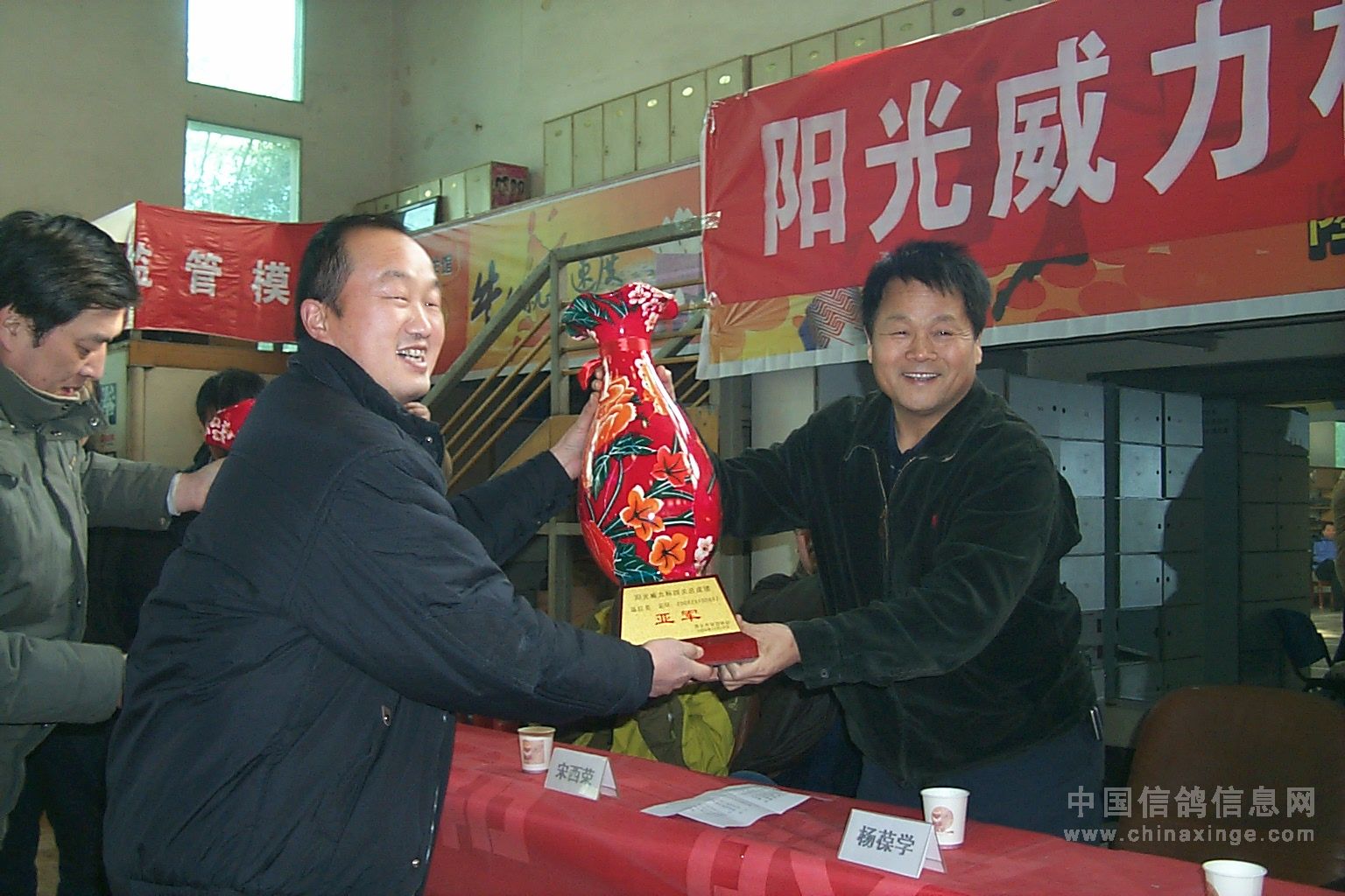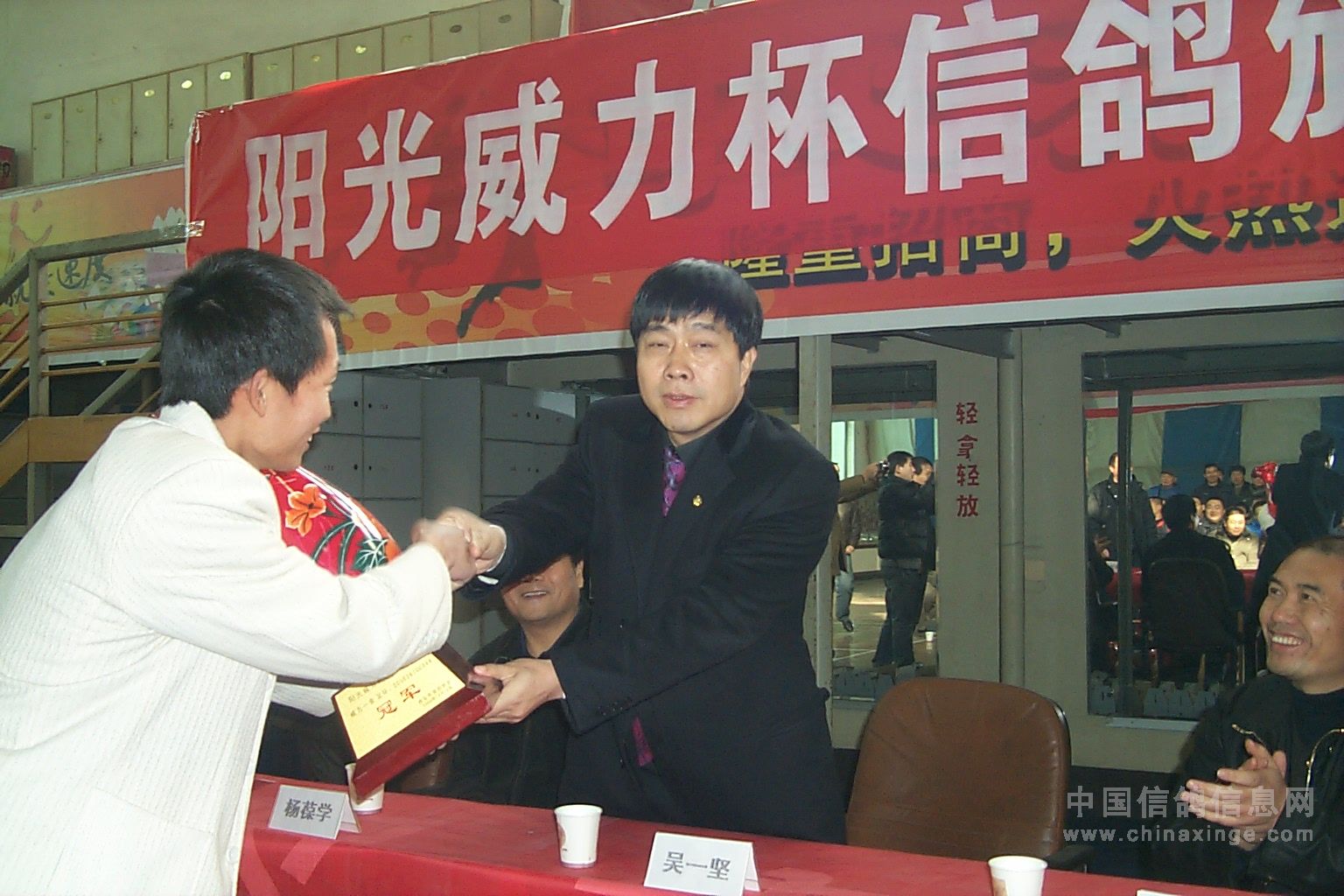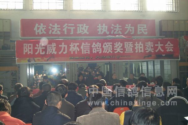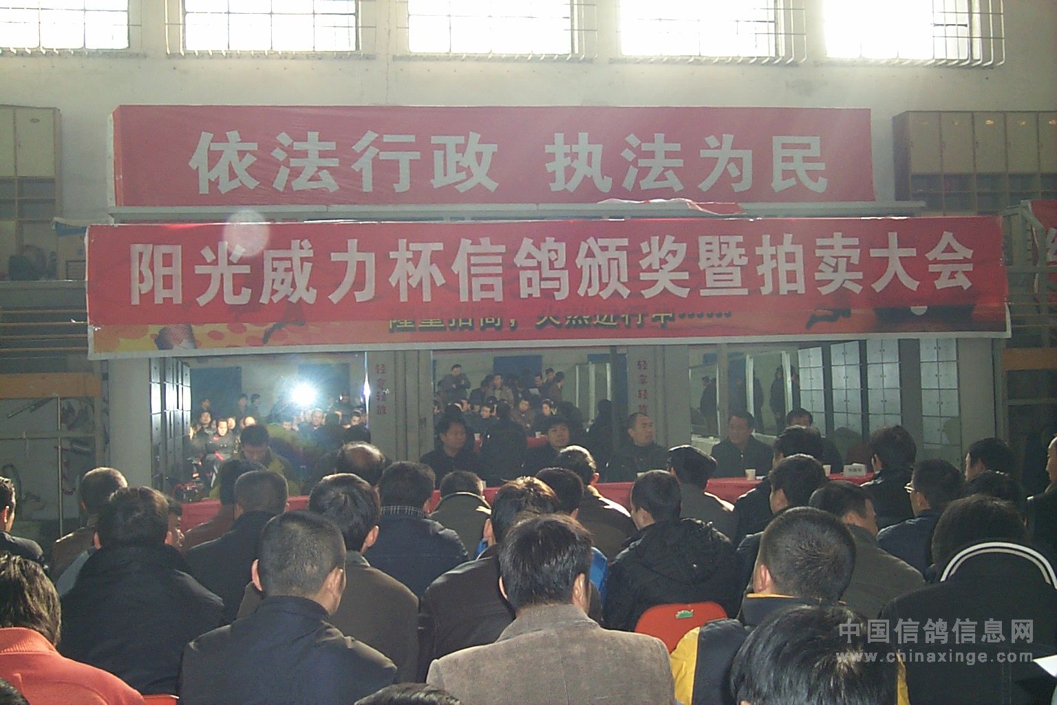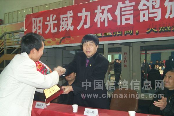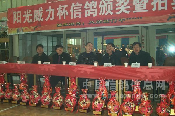 2008年31日下午14:00时,在西安市体育场召开了西安市信鸽协会阳光威力杯四关赛颁奖大会,主席台上就座的有西安市体育总会宋西荣秘书长、吴一坚、杨保学、何志方、石炜、王长安、冯建军先生,信鸽协会秘书长王长安先生主持了颁奖大会,由宋西荣、吴一坚、杨保学、何志方先生给获得前30名鸽友颁奖,现场一片掌声。