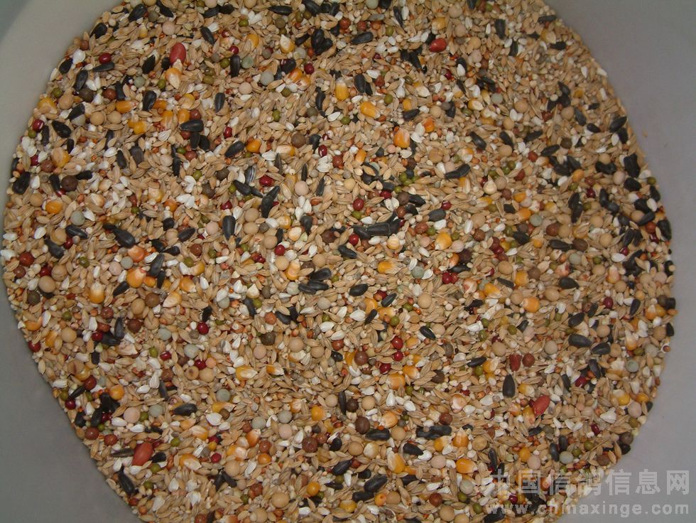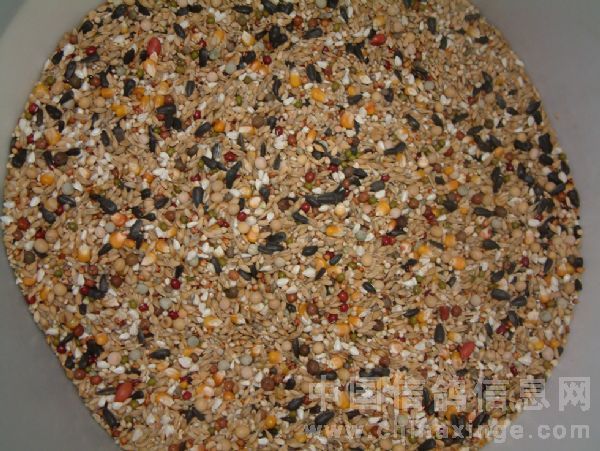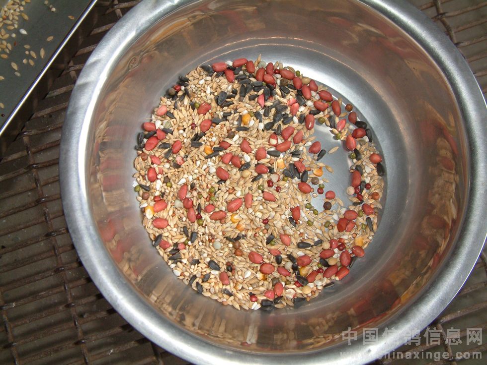 四月初,笔者到公棚观摩时,目睹了他把玩幼鸽的过程。(图4-18)那时,他的饲料很特别,粗料不多,细小粒却很多。笔者曾经数了一下,至少有28种之多。