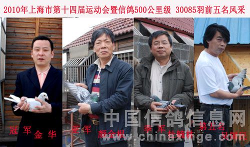 下午,13点34分,第一羽来自嘉定区的鸽友诸呈祥报到,最终冠军则由浦东金桥鸽友金华一羽07-158323红轮砂眼雌以1056.18分速赢得2010年上海市第十四届运动会暨信鸽500公里级比赛(30085羽)桂冠,同时亦取得了浦东区冠军。金华先生本人在浦东街道武装部工作,养鸽多年,而中间经历搬迁立新棚亦有一年半左右,新棚位于高楼14层顶上,一览众山小。07-158323红轮砂眼雌赛鸽来自于其好友吴顺三桑吉士系,此鸽在两周前上海市长宁区五区联翔(12309羽)获103名,为之后的冠军打下了坚实的实践基础。在饲养及训放等方面,其进行了科学的搭配与总结,时刻以自然为上,并结合鸽子本身的素质,保证了赛鸽的健康,并取得了如此上佳的翔绩。