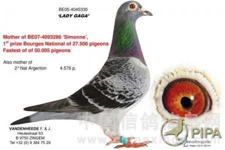 - 母亲卡卡女神(Lady Gaga)亦是席梦(Simonne)2009年波治全国26910羽成鸽冠军(约五万羽最高分速)的母亲