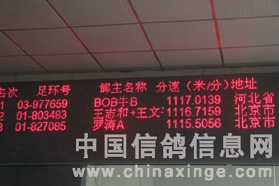 北京的今天,与昨天相比来了一个大变脸,与昨天的天气不同。鸽友都在扳着指头掐算赛鸽归巢的时间,不时地仰望天空。公棚场内,经理办公室和接待大厅聚会的无不是聊得热火朝天。说到打指定鸽,有一位鸽友特别爱打指定鸽,自己的不打,想打别人的。这时,米先生告诉他指定牛金顺的肯定能赢,因为他不会到现场。就这样,这位鸽友就指定了BOB全部的赛鸽。指定时,是按照公棚提供的预赛归巢名单指定共七羽,这位鸽友盼望能够赢钱呢。下午2点48分,一羽赛鸽率先归来,不到几秒,又二羽归来,三羽几乎是相差不了多长时间落棚。一羽灰鸽率先进棚,大家谁也不知道这羽是谁的,此时,屏幕显示“BOB牛”的赛鸽为第一名。全场呼声起来:牛,就是牛。鸽友一方面为冠军而欢呼,另一方面为BOB公棚老板牛先生而祝贺。此时,又有二、三羽地归来,既看落棚实景,又看大屏幕,真是为获奖者高兴。特别是一位女性参赛者,虽然交了六羽,决赛只剩一羽,但看到赛鸽归来特别地高兴和开心。她被现场男鸽友那种企盼,那种观摩的心情所感动。她激动地对笔者说:真没有想到赛鸽是那么地吸引爱好信鸽的人们啊。