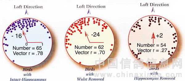 三个图形分别代表完整海马回、脑视丘被移除以及海马回被移除的鸽子的方向辨识力。每一个黑点代表一只鸽子从一放飞地朝鸽舍方向的消失承轴。里面的箭头代表平均向量,使用完整海马回的鸽子图的比例尺可以读出平均向量的长度(r)。这个比较图清楚显示,海马回的移除会导致鸽子失去方向感。这个方式可用来评估幼鸽的海马回,并且证明近亲交配会造成海马回的劣化。训练幼鸽时,这个方式可以提供方向辨识力的重要证据。您可以此为基准,测量幼鸽的归巢力。海马回完整的鸽子的消失承轴是-16,脑视丘被移除的鸽子是-24,海马回被移除的鸽子则是+2,类似的幼鸽的消失承轴经常被记录(一个个人的观察)。