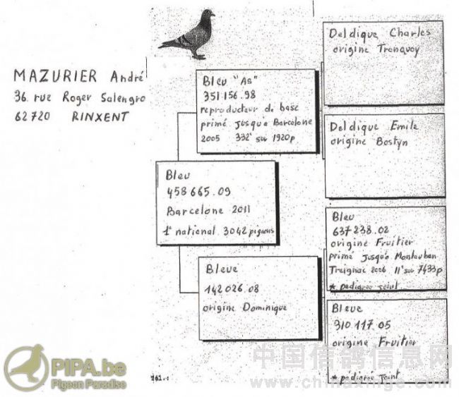 这羽冠军鸽的血统非常复杂,现在安德烈除了有他父母的老鸽系外,他还曾经引进了杰拉德和凯瑟琳.弗鲁蒂尔夫妇(Gérard and Catherine Fruitier)和加来(Calais)的本兄弟(brothers Ben)的鸽子,另外还有波斯丁(Bostyn)和托库瓦(Troncquoy)的鸽系。
