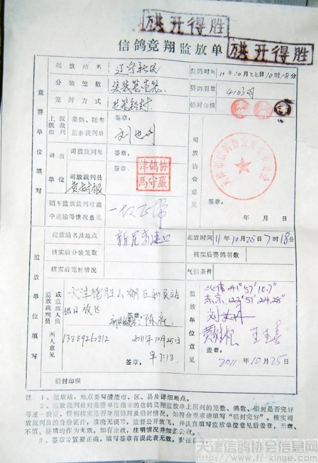 监放单(辽宁省委派的新民市鸽会监放人员没有来,高速收费人员见证,并签字留联系电话)