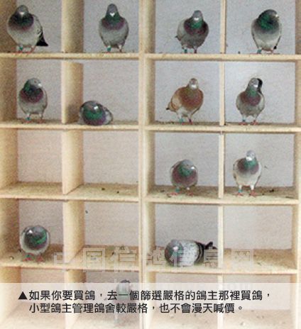 这才叫做真正的鸽主。十分遗憾的事,我们的小型鸽主已不再有能力参加中距离赛及700公里以下的长距离赛了,否则比利时鸽的身价必然狂涨,而小型鸽主也能得利。然而现在的情况是,冠军鸽被宰了,因为它们飞100公里无法名列前茅。而且那100公里的比赛,鸽主“飞”得比鸽子还快!但是如果鸽子不肯飞,你又不可能杀了鸽主。让你的鸽子参加你“追”不上的比赛,参加的比赛距离愈远,鸽子自己的运动技能愈重要,而在短距离赛中,鸽主的角色比较重要,也因为如此,筛选鸽子在比利时多数鸽舍里都做得不好。在此,我可以给你一些筛选幼鸽的忠告。