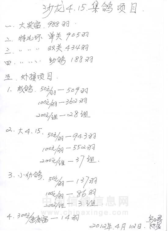 新闻发布:重庆巍尚赛鸽传媒 集鸽时间:4月12日17:00--13日凌晨 集鸽地点:重庆市南岸区鸽友沙龙 比赛:鸽友沙龙2012大小415特比环决赛(500公里),保底10万元大奖赛 决赛司放地:陕西凤县