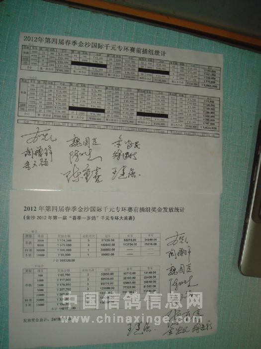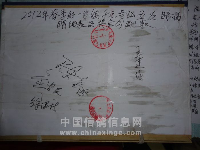 在鸽友及裁判员的监督下将“2012年春季好一岁鸽千元专环五次暗插”的名单开封、核实