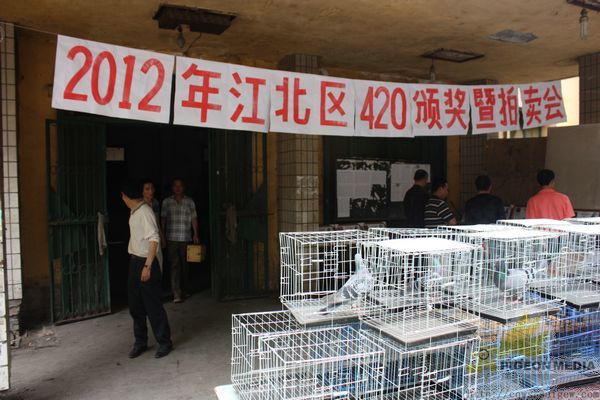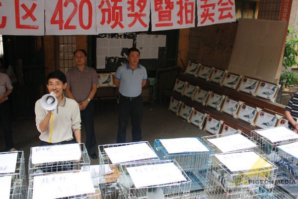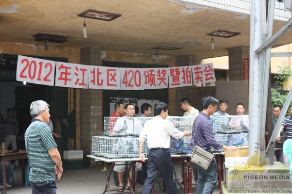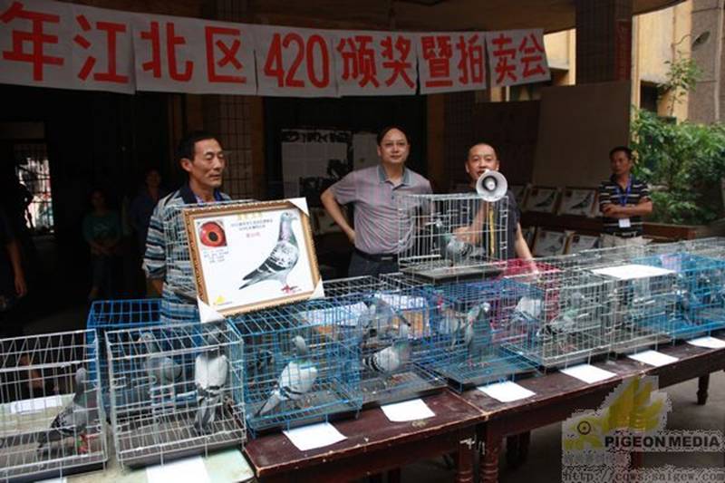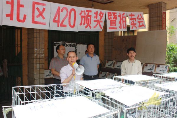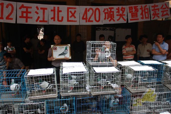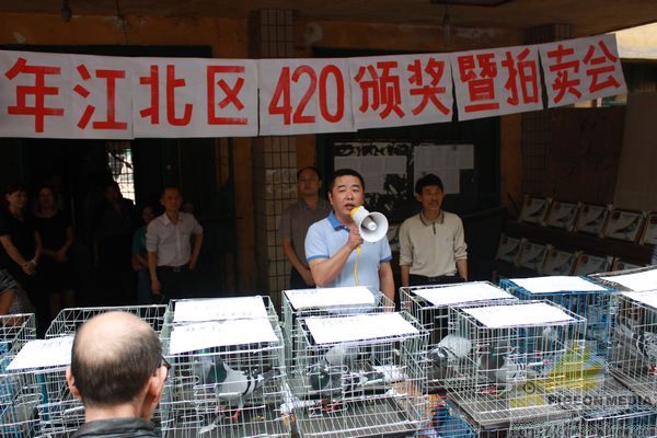 重庆市江北区信鸽协会420决赛获奖鸽颁奖拍卖会,于5月6日下午在江北区鸽协大石坝进行,由重庆阳光鸽舍谢林执拍。到场人物组成:获奖鸽友、观摩鸽友、江北区体育局工作人员、江北区鸽协主席黄焰、副主席万斌、谢浙渝、区鸽协裁判长苏德元。本次拍卖总金额:111800.00元。