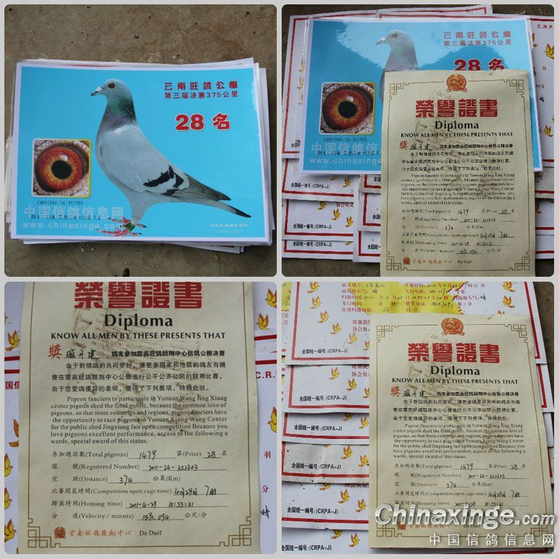 “赛绩就是一切,赛绩会说话”——云南旺鸽公棚2012年春季公棚,共交鸽5羽,决赛上笼2羽,编号2011-24-352303灰鸽获得决赛28名,奖金一万元。虽说名次不是太高,可对于一位仅仅重新养鸽一年的农村鸽友来说,已经相当好了。公棚进奖人欢笑,祝贺您,我的朋友!