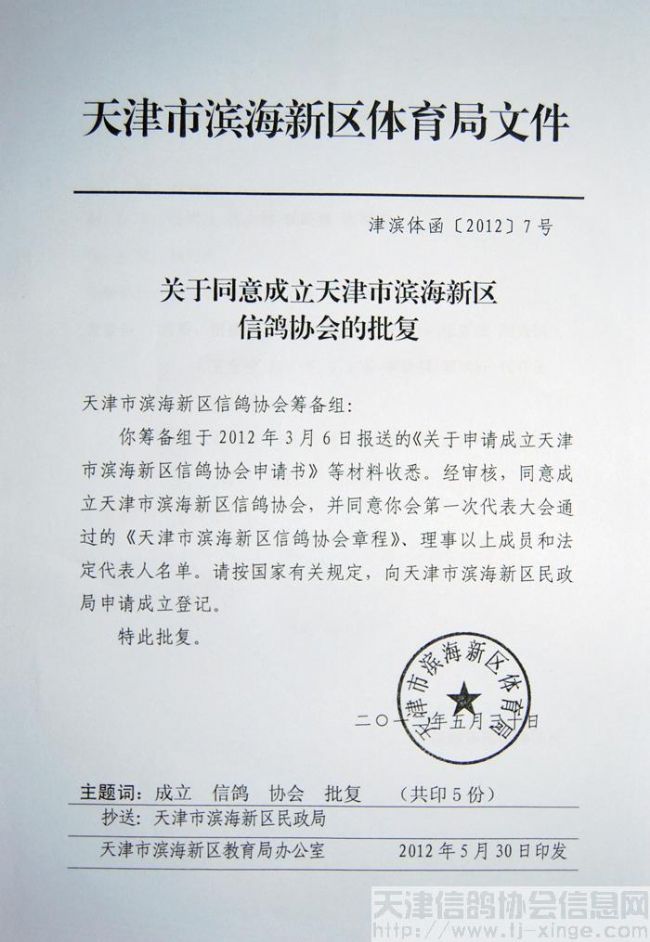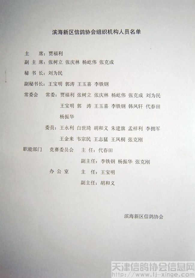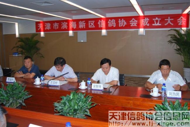 2010年初,天津市滨海新区正式成立,为了适应新形势的发展,更好地为广大鸽友服务,经过滨海新区体育局批准,滨海新区信鸽协会正式成立。成立大会由滨海新区体育局群体处付处长主持,首先宣读体育局批复的《关于同意成立天津市滨海新区信鸽协会的批复》文件;随后宣布滨海新区信鸽协会首届组织机构人员名单,贾福利先生当选首届滨海新区信鸽协会主席,刘卫民先生为秘书长。大会第三项由滨海新区副秘书长王玉喜先生宣读《滨海新区信鸽协会章程》。