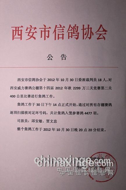 最后,祝愿陕西参加抓赛的鸽友能够取得全胜,预祝所有参加西安威力公棚大奖赛鸽友都有好运气,预祝西安威力公棚第二关400公里比赛取得圆满成功。