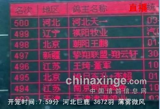 北京金顶长城公棚今日举行300公里预赛。放飞地为河北巨鹿,7点59分放飞。共有3672羽赛鸽。