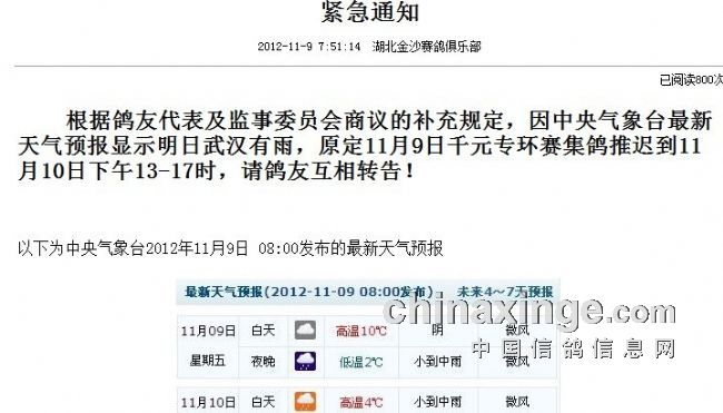 今天在网上看到2012年11月9日,金沙俱乐部紧急通知:根据鸽友代表及监事委员会商议的补充规定,因中央气象台最新天气预报显示明日武汉有雨,原定11月9日千元专环赛集鸽推迟到11月10日下午13-17时。