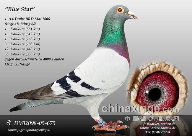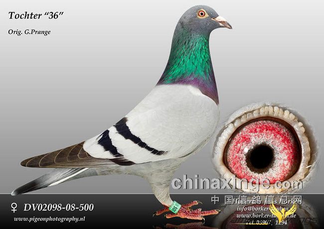 父:02098-01-36 “36” - 普朗格顶级雄。全兄弟“1009”(2位全德雄鸽鸽王2003)。“36”直子“灰色之星”。传奇大铭鸽“无环号12”x普朗格最佳种雌“我们的路易斯直女”(考夫曼)作出!