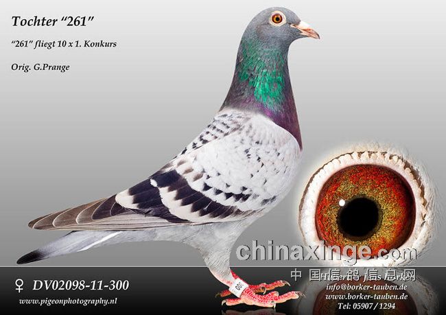 母:02098-01-18“所向无敌孙女”-全姐妹“726”,2001年全德雌鸽鸽王2位。“所向无敌直子”(迪克凡代克原环)x“昆夫兰直女”(迪克凡代克原环)作出。
