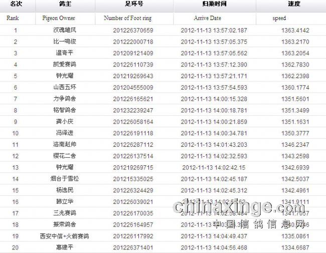 陕西天平公棚第三关于11月13日7:50开笼,司放地榆次,实测空距500.4公里。司放地纬度:37.34.23.19,经度:112.41.39.55。