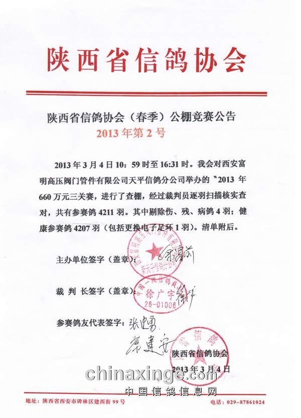 2013年陕西天平春棚第二届三关大奖赛查棚工作结束,共计健康赛鸽4207羽。