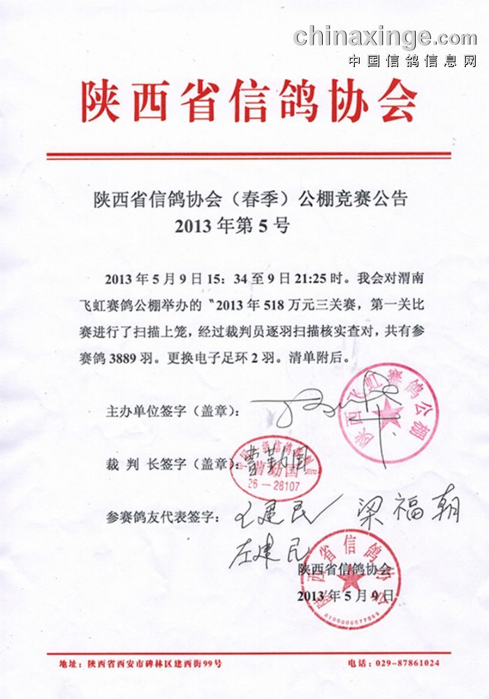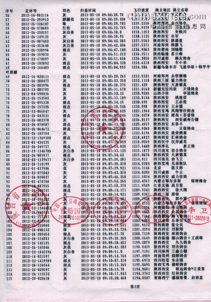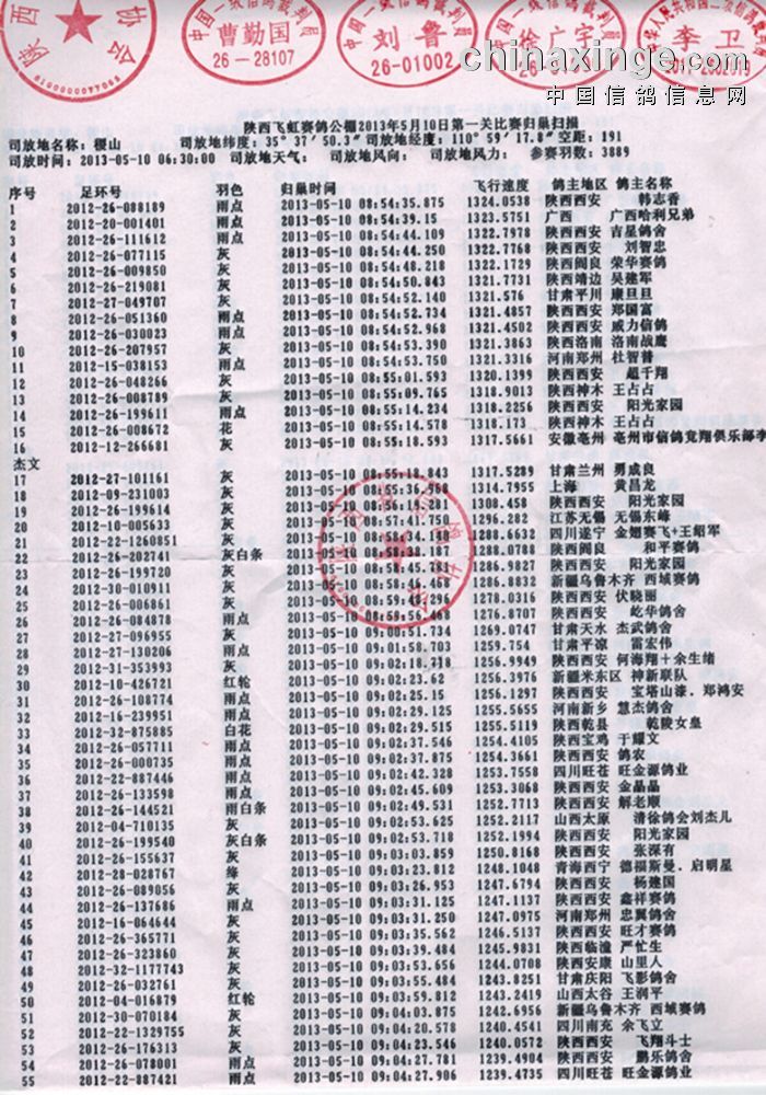 陕西飞虹赛鸽公棚2013年5月10日第一关100名归巢清单