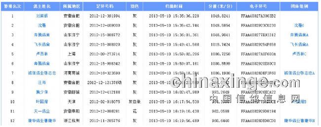 根据公棚直播平台,安徽华汇2013年春赛500公里决赛15点35分见鸽归巢,首羽赛鸽鸽主刘殿辉,分速1049.8241米/分。以下是比赛前10名直播成绩截图: