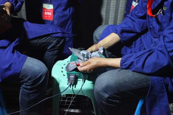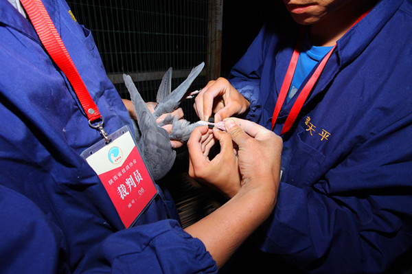 裁判员正在扫描第一羽赛鸽