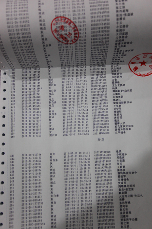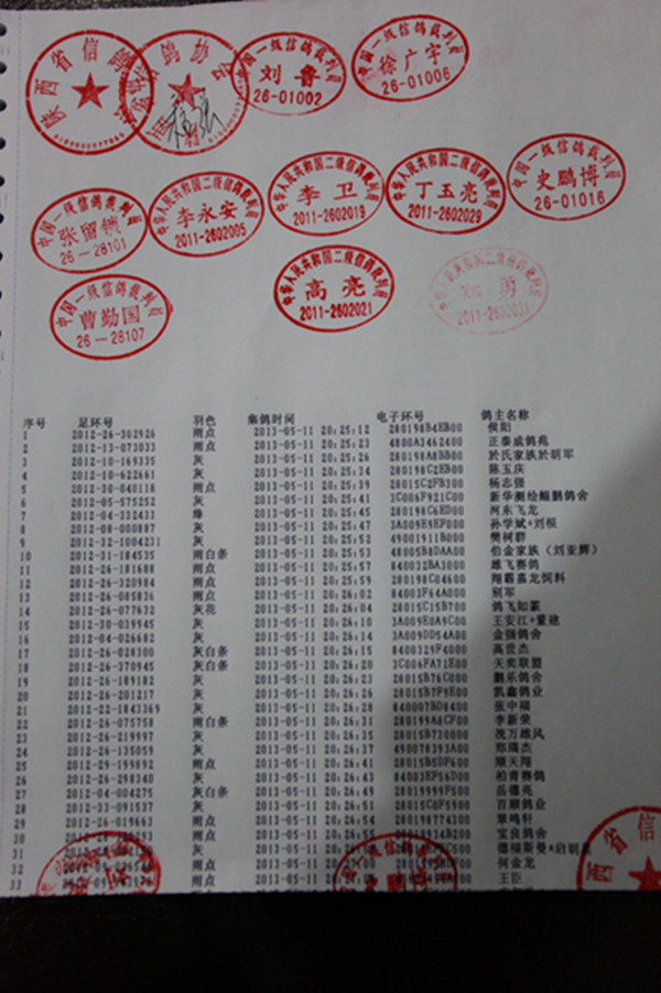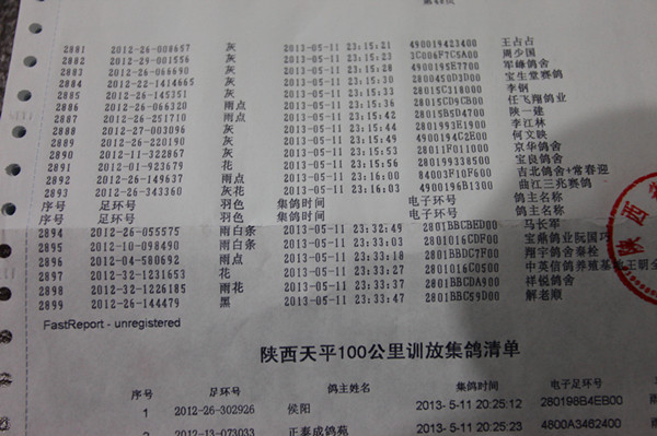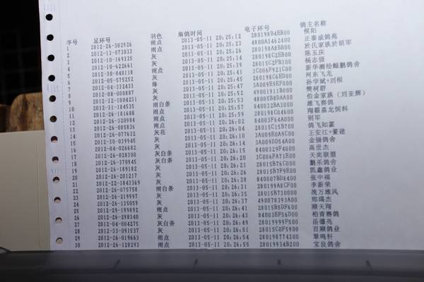 同步打印机所打印的集鸽数据