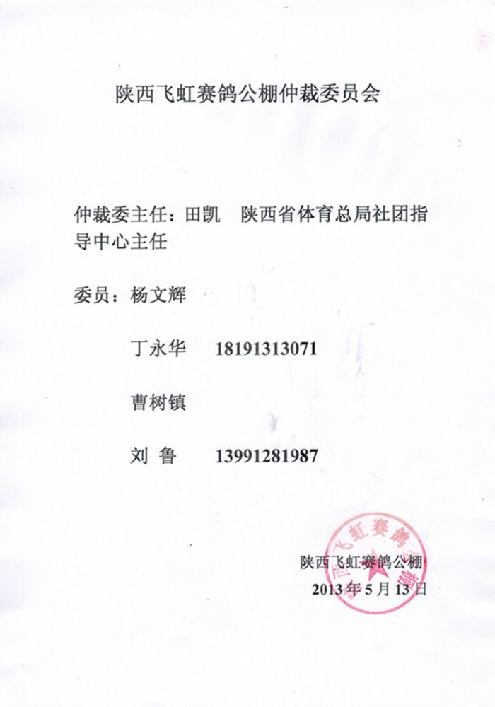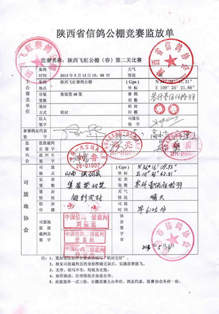 陕西飞虹公棚第二关比赛已于2013年5月14日早上6点05分在山西省洪桐开笼放飞,空距281公里,坐标N:36°16′9.9″,E:111°36′42.8″,天气晴,鸽群走势良好。预祝各位参赛鸽友取得好的成绩。 陕西省信鸽协会竞赛监放单与前200名原件