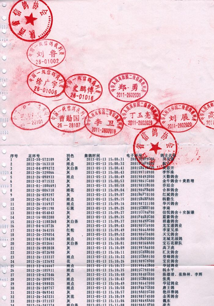 陕西省信鸽协会竞赛监放单与前200名原件