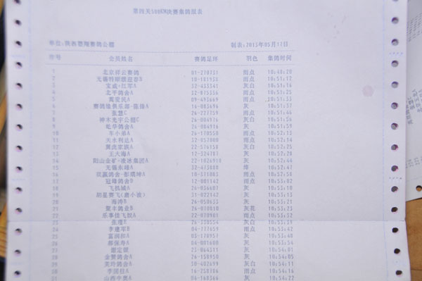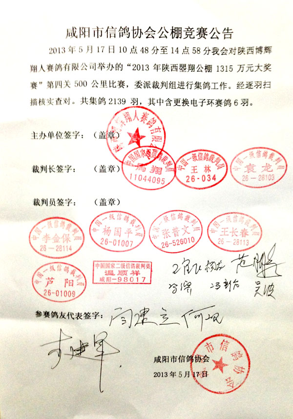经过第一关200公里热身赛当日归巢2721羽,第二关300公里速度赛当日归巢2442羽,第三关400公里拉力赛当日归巢1565羽,今天第四关500公里进行集鸽,由咸阳市信鸽协会委派的裁判组对5月17日的集鸽工作全程执裁。并且也有部分外地鸽友提前到达公棚观看集鸽,同时国内著名媒体《赛鸽天地》也在同步进行视频直播。