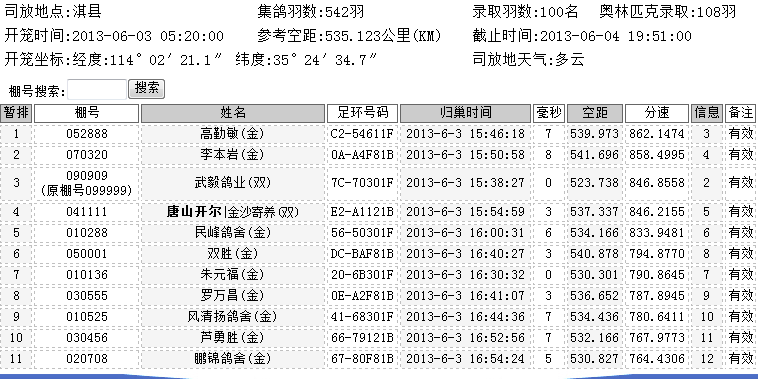 湖北金沙赛鸽俱乐部2013年春季千元专环第二关淇县站比赛,于今天(6月3日)早上5:20开笼,司放地天气多云,微风。司放地坐标:经度114度02分21.1秒,纬度35度24分34.7秒,参考空距:535.123公里。经过第一关的考验后,本次比赛集鸽542羽,有奖名次录取100名,全国鸽王赛录取108名。