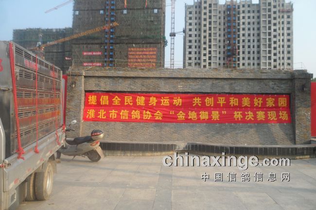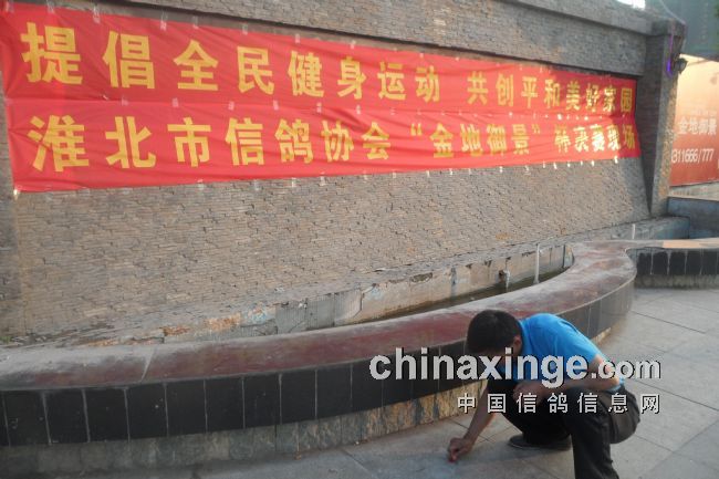 1、淮北市信鸽协会举办本次赛事的主题条幅“提倡全民健身运动 共创平和美好家园”