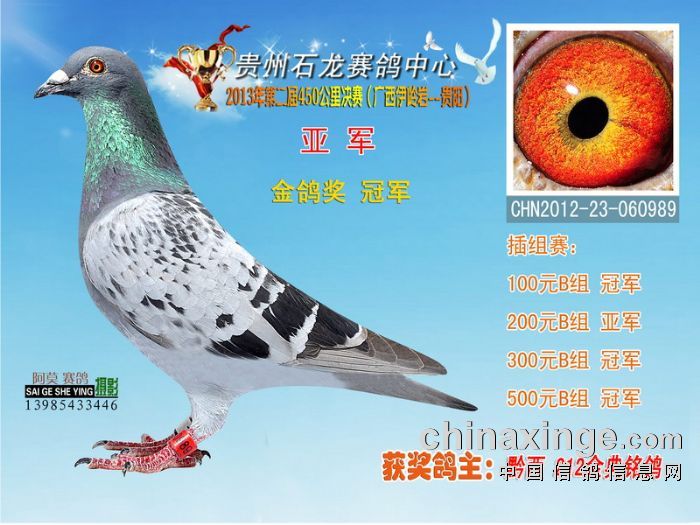 贵州石龙赛鸽中心2013年决赛颁奖暨拍卖大会定于6月15日(星期六)在贵阳市白云区政府会议中心举行,上午8点领奖金,8点30分开会颁奖,9点开始拍卖,当天领取拍卖返还款。拍卖顺序从180名开始至冠军,然后181名拍至300名。