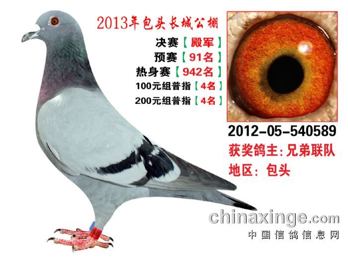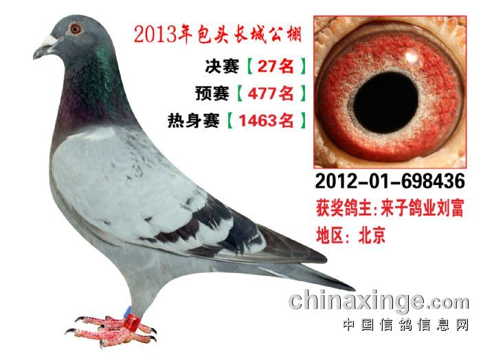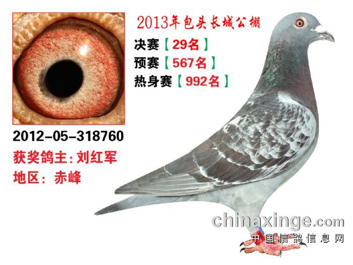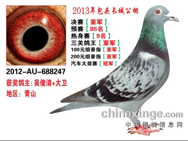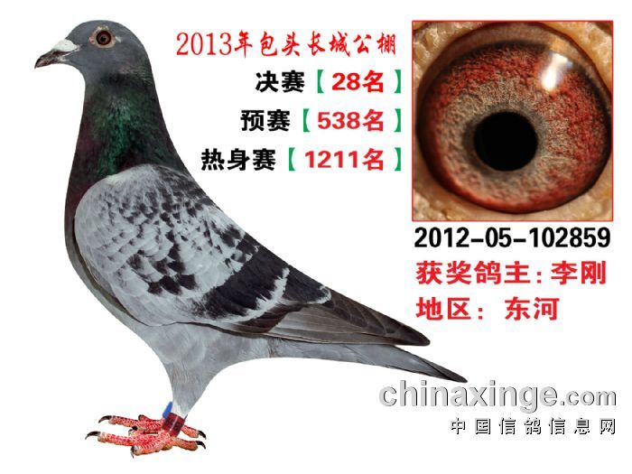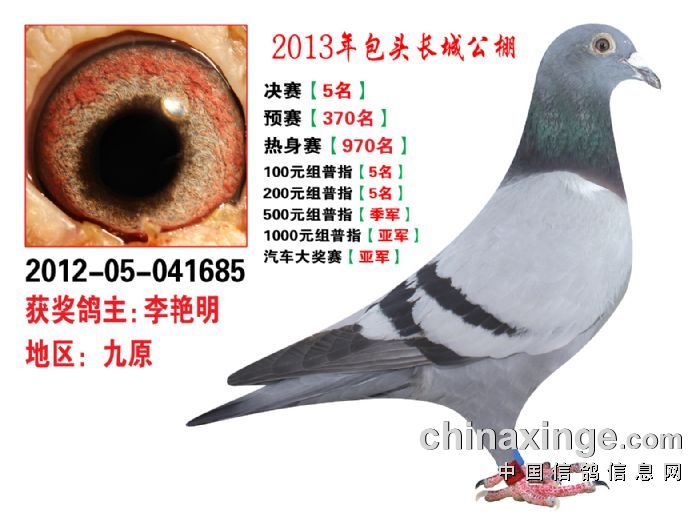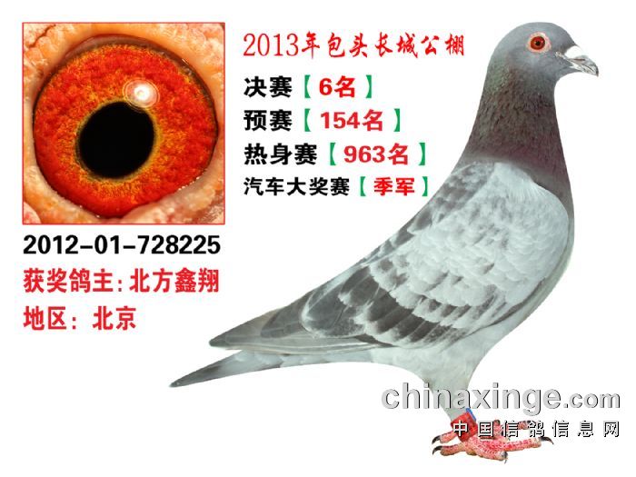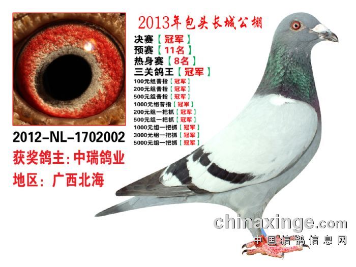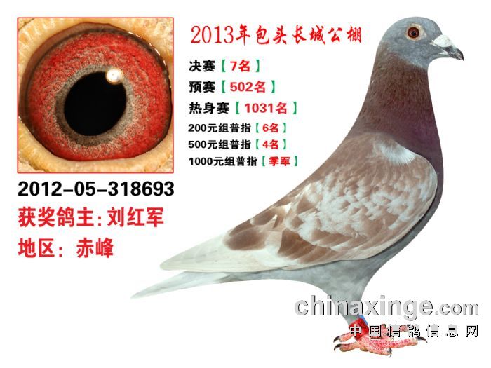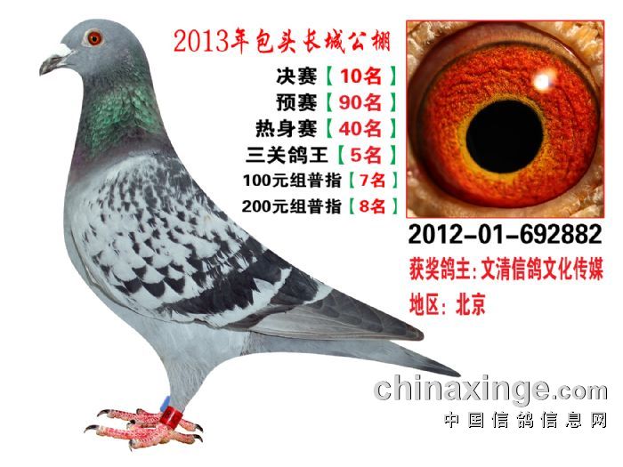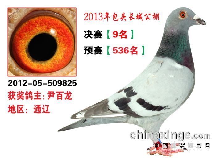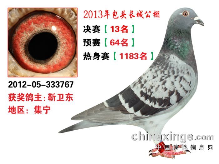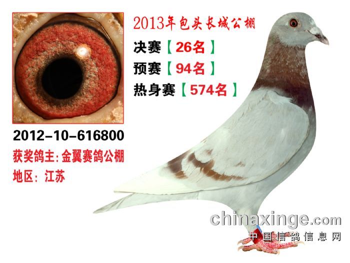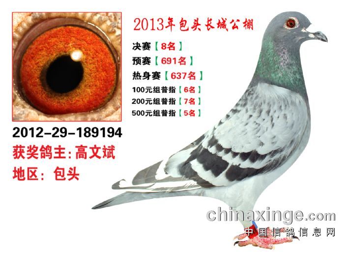 包头市长城公棚于2013年6月23日上午9点30分,在包头市阿健肥牛楼外楼海鲜店(青山区建设路包头市供电局东侧)举行颁奖及拍卖大会。长城公棚春季决赛于6月15日早上五点在宝公社开笼,比赛前十名成绩如下: