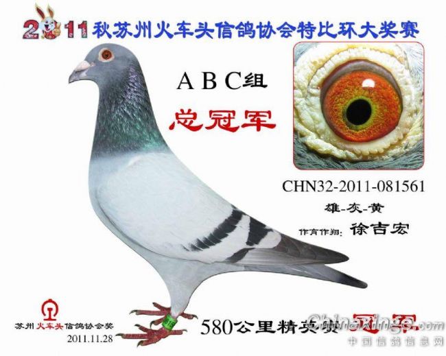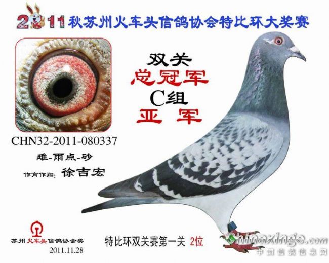 舍内现有全兄妹4羽,二公二母,成绩都很突出,其姐鸽环号2011-32-080337,获2011年苏州火车头特比环双关总冠军,第一关500公里亚军,第二关580公里5名;2012年苏州火车头春季特比赛其兄环号2011-32-076556得B组41名,遇恶劣天气,当天回来鸽子仅60多羽;2013年春季苏州火车头530公里特比赛其妹鸽环号2012-32-136348获B组17名、精英14名,赛程雾气大,十分难飞,当天1400多羽鸽子也只有60多羽回来。这路鸽子善飞恶天气,且是春秋赛通吃,出赛十分了得,很有霸气。