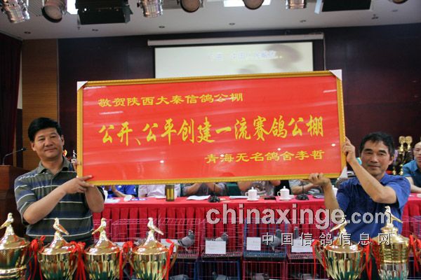 飞虹公棚今年第一届大奖赛颁奖暨拍卖大会在西安未央湖华浮宫大酒店举行,中央电视台海外频道栏目原主持人樊颖女士主持。各级领导致辞讲话,比赛司放地山西临汾信鸽协会赠送“艰辛曲折放飞路,诚信公正结硕果”;山西晋中信鸽协会赠送“按章办事一丝不苟干净,公开公正值得鸽友信赖”;渭南大华公安分局“以鸽交友情似海,科学训飞谱新章”;山西金海公棚“志成永远,放飞高鸽”;山西河东公棚“源运昌隆增百福,飞虹振兴获千祥”;中国钓鱼岛圣保罗鸽舍“打铁还要自身硬,阳光透明是公正,祝拍卖会圆满”牌匾。会议开得隆重热烈,赢得阵阵掌声。