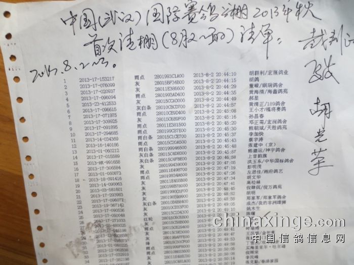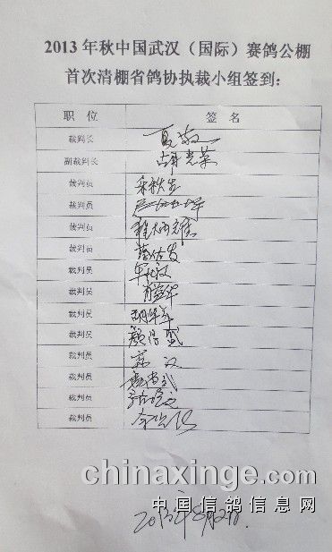 中国(武汉)国际赛鸽公棚2013年秋赛首次清棚于今早圆满结束,此次清棚共有来自广西、湖南、江苏、麻城和武汉等地鸽友代表莅临本公棚观摩。在这里武汉国际公棚全体工作人员再次对各位鸽友给予的信任、支持和帮助,和参与此次清棚的裁判组表示感谢。此次清棚共有存棚鸽6313羽,本公棚网站在今后会及时发布赛鸽训养情况,为每位鸽友提供满意的服务。