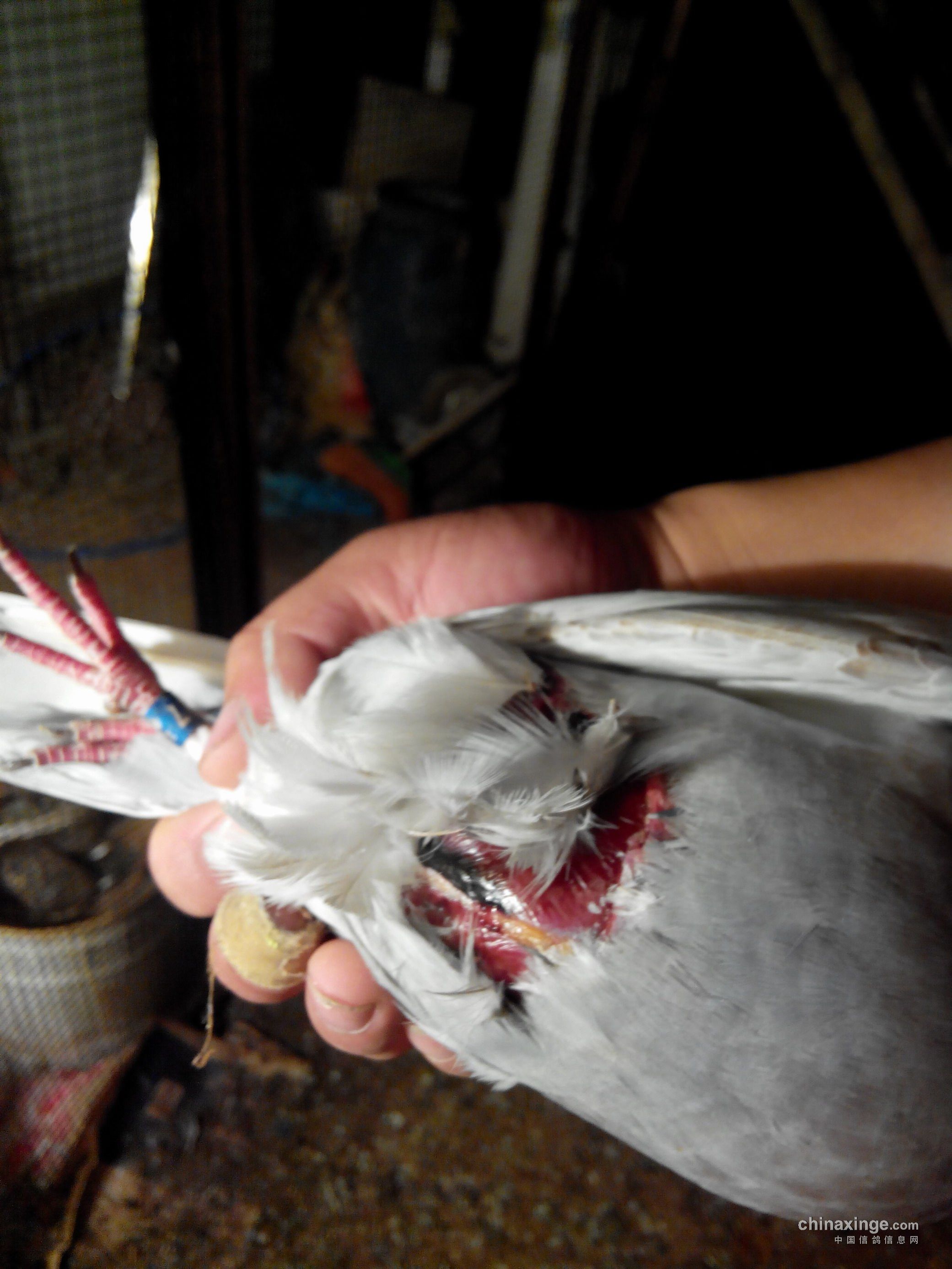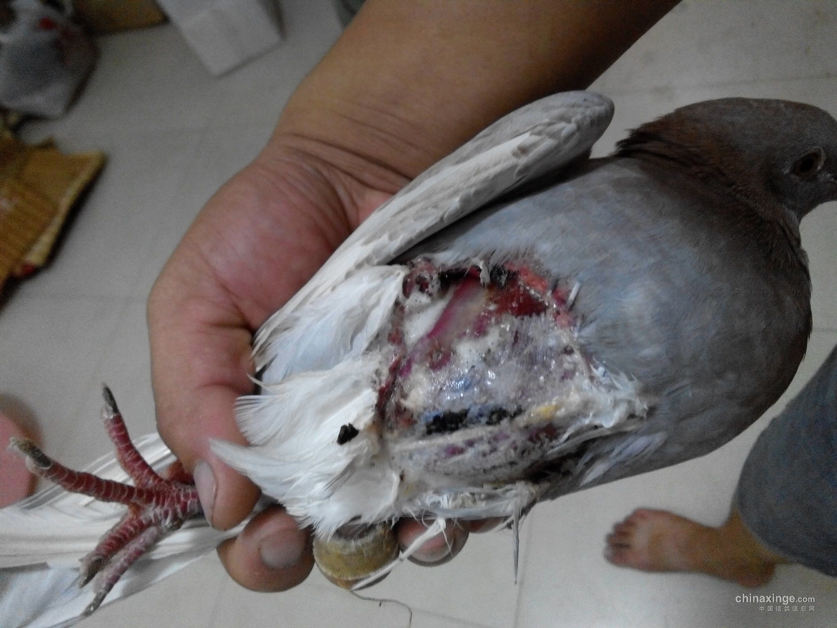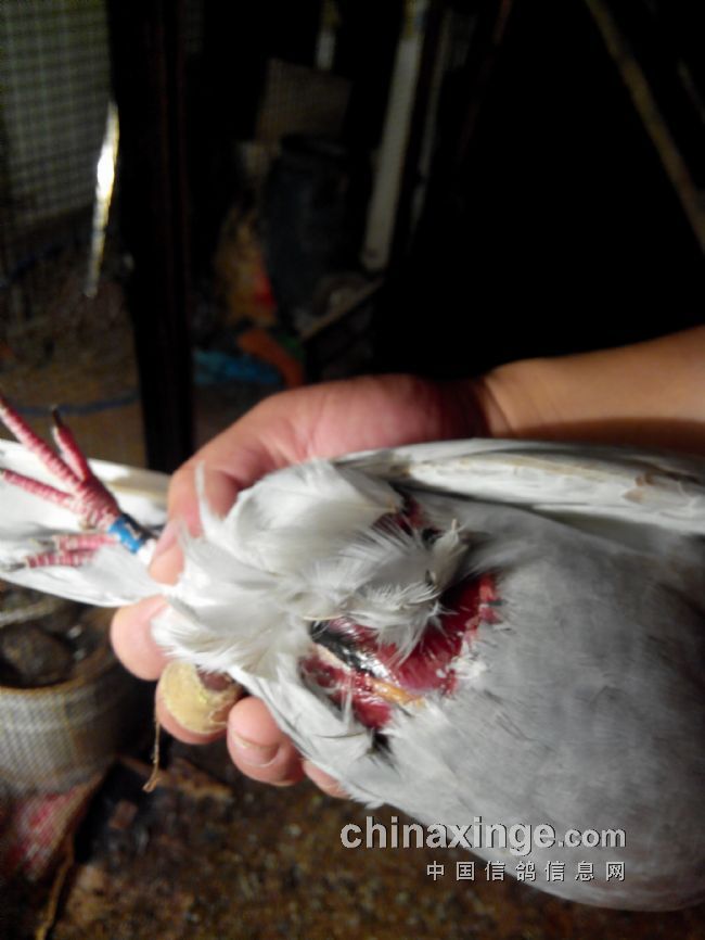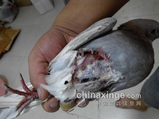 这只鸽子比赛获奖的可能性几乎没有了,可以说毁掉了,严重的撞击,会导致内脏出血,我解剖过数只,都是一样情况,实践中也是,很少再有归巢的.留种可能没事