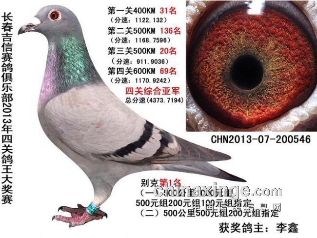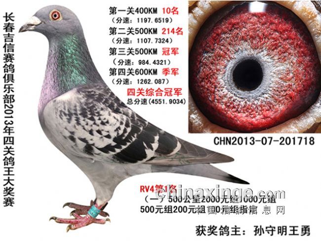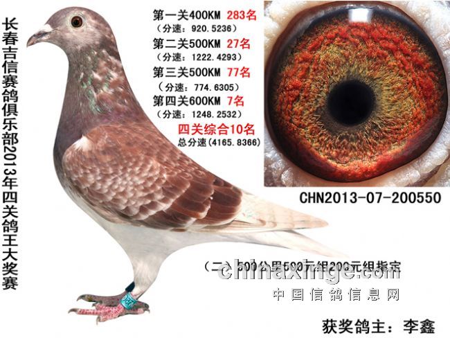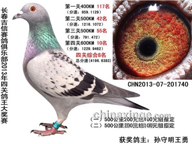 长春吉信赛鸽俱乐部2013年秋季“吉信杯”千元特比环于9月15日开赛,第一关集鸽1739羽,经过前三关比赛的淘汰,至10月6日第四关仅剩下240羽赛鸽,最终孙守明、李鑫、力均鸽舍分别获得综合四关赛鸽王前三名。以下是比赛综合前十名成绩: