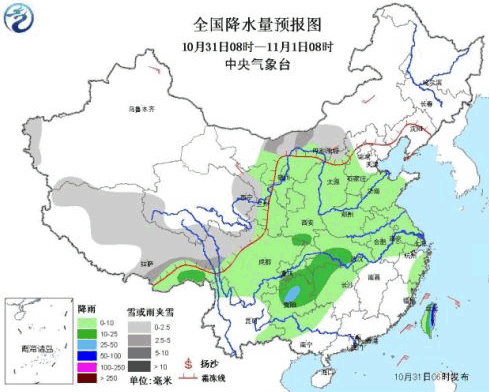 中东部地区有大范围降水:10月31日-11月2日,西南地区中东部、西北地区东部、江南西部、江汉、江淮、黄淮、华北、内蒙古中东部、东北中南部等地有小到中雨,其中贵州中部等地的局部地区有大雨。