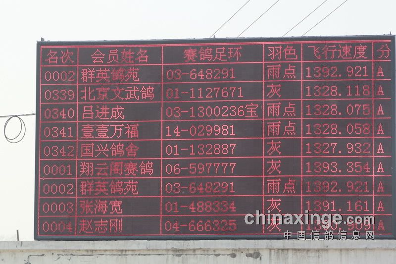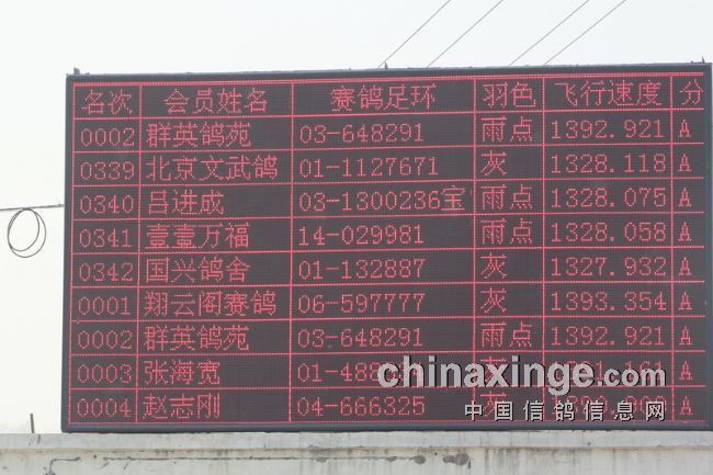 第一批赛鸽于下午1点53分进棚,成绩即刻显示在大屏幕上,众鸽友奔向两个大屏幕,场景非常壮观,激动时刻只有在现场的鸽友才能感受到。